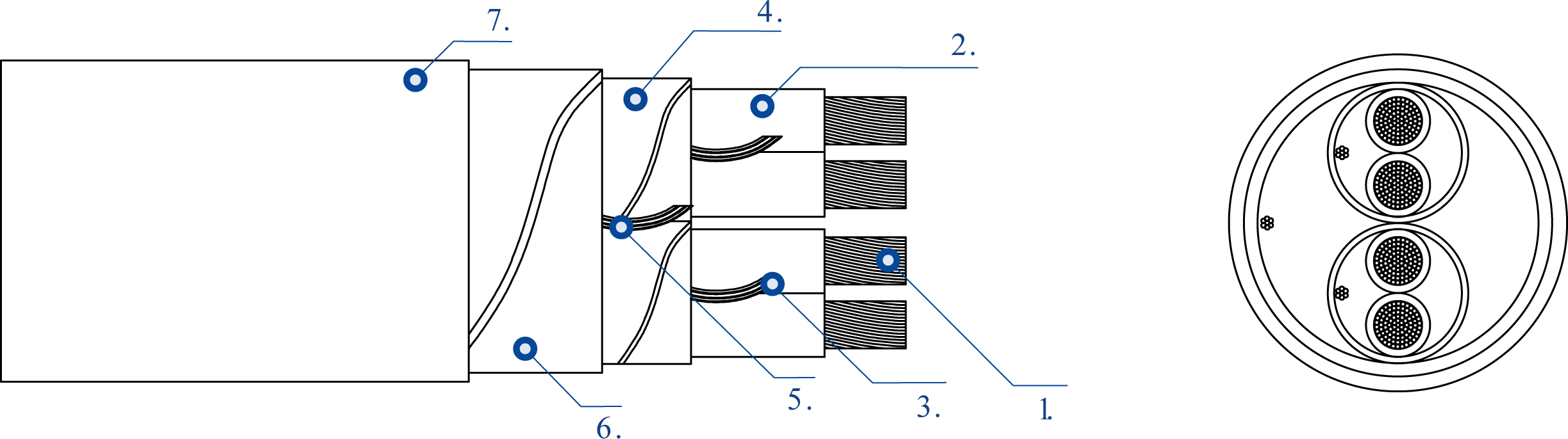 | DJYVP2 | 銅芯聚乙烯絕緣聚氯乙烯護套銅塑復合帶繞包總屏蔽計算機電纜 | 0.5~2.5 | 1~50×2, 1~24×3, 1~10×4 | 300/500V |