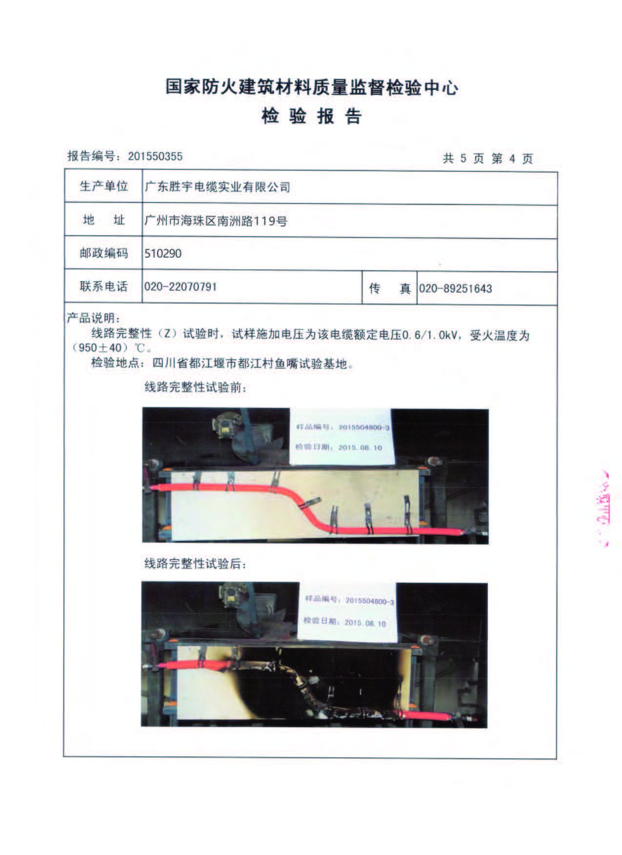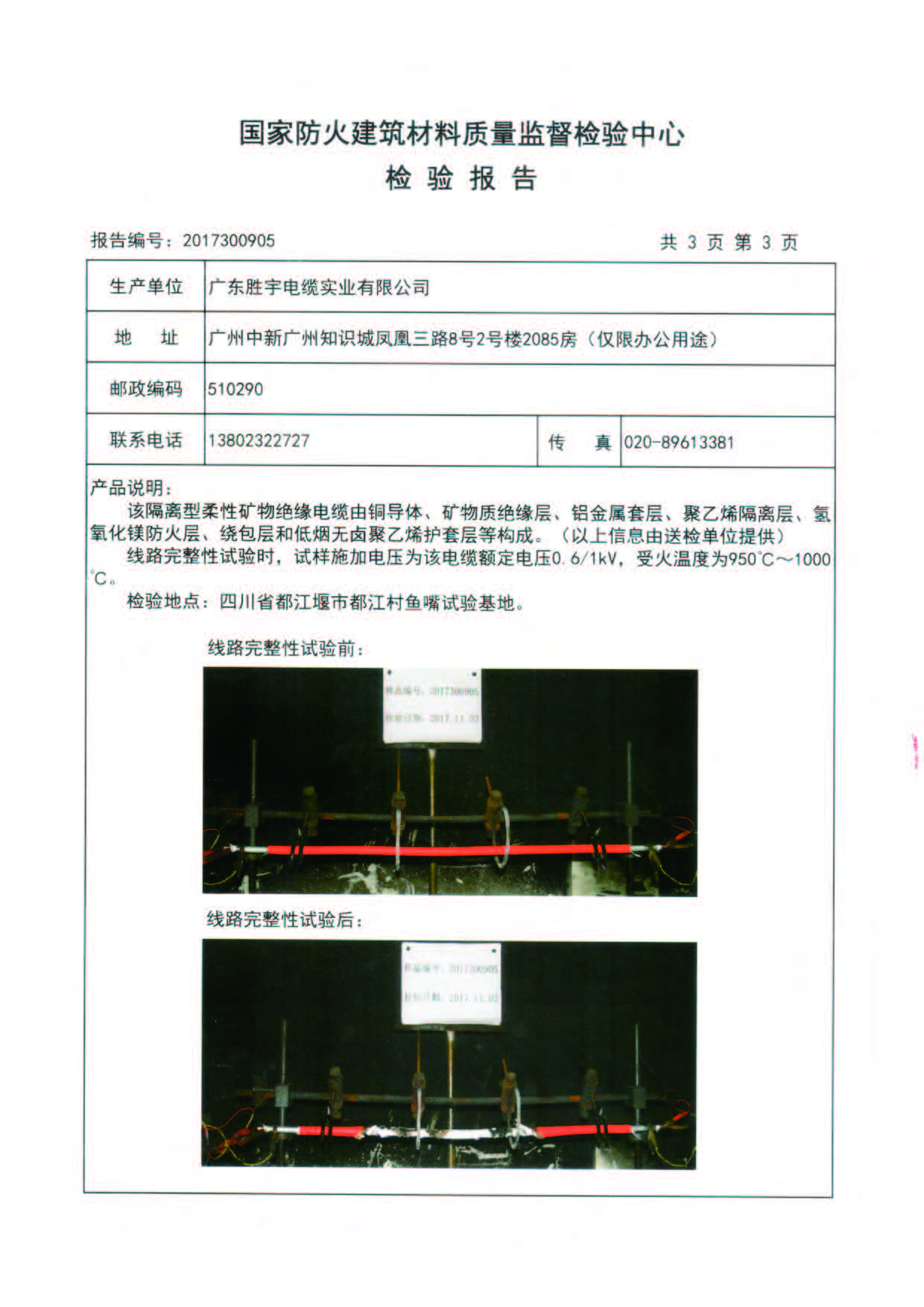 標準中的3個試驗,每做一個新實驗都得換一個新的樣品,勝宇礦物絕緣電纜可以輕松遵守和承受最繁重的等級類別C、W、Z,甚至3個試驗中整個過程中使用同一個電纜樣品不需更換。